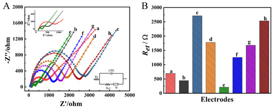 EIS of different modified GCEs in 0.1 M KCl solution containing the 5 mM [Fe(CN)63−/4−](1:1) (A) and the Ret values for different modified GCEs (B). a: bare GCE, b: Zn/Fe-ZIF-NPC/GCE, c: NiHCF-NPs/GCE, d: NiHCF-NPs/Zn/Fe-ZIF-NPC/GCE, e: AuNPs/NiHCF-NPs/Zn/Fe-ZIF-NPC/GCE, f: Apt/AuNPs/NiHCF-NPs/Zn/Fe-ZIF-NPC/GCE, g: MCH/Apt/AuNPs/NiHCF-NPs/Zn/Fe-ZIF-NPC/GCE, h: PQ/MCH/Apt/AuNPs/NiHCF-NPs/Zn/Fe-ZIF-NPC/GCE. The modification conditions are the same as in Figure 4.