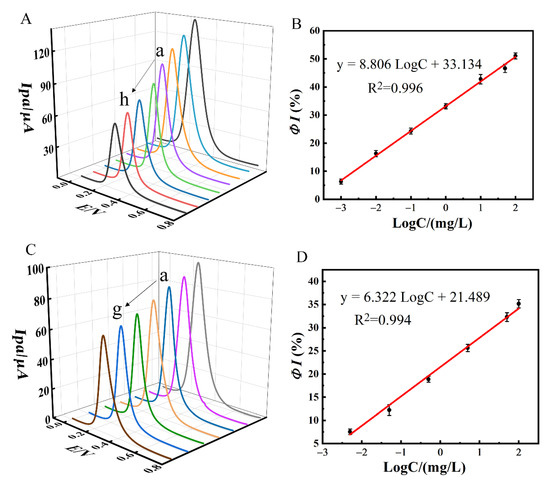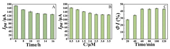 The immobilization time and concentration of the aptamer were optimized and the results are presented in Figure 9. It can be seen that the Ip decreased with increasing immobilization time and remained almost constant after 12 h (Figure 9A). Hence, the immobilization time of 12 h was selected. In the range of 0.5∼3.5 μmol L−1, the Ipa also decreased with increasing concentration and tended to be stable when the concentration exceeded 2.5 μmol L−1 (Figure 9B), indicating that the binding of aptamer on the modified GCE surface reached saturation. Therefore, an aptamer of 2.5 μmol L−1 was selected for the preparation of the sensor. In addition, the effect of incubation time of PQ (10 mg/L)on the sensing performance was also investigated using percentage drop in current signal (ΦI) after incubation as the indicator (Figure 9C). It can be seen that as the incubation time was increased from 20 to 60 min, ΦI increased, indicating that more PQ was bound to the modified GCE. After 60 min of incubation, ΦI was almost unchanged, indicating that the binding between PQ and aptamer reached equilibrium. Therefore, the incubation time was chosen to be 60 min.