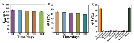 Storage stability is an important performance indicator for the sensor. The stability of the prepared aptasensor was examined from two aspects. The same batch of sensors was prepared and stored at 4 °C when not in use. Firstly, three sensors were taken and their current response in 0.1 M PBS was measured periodically. The current response remained at 93% of the initial value after 28 days (Figure 11A), indicating that the modified materials and the NiHCF-NPs probes attached on the modified GCEs were stable during storage. Secondly, at intervals of 7 days, three fresh sensors were taken to measure their detection signal (ΦI) for the same concentration of PQ (10 mg/L) and it was observed that the ΦI value of the sensors was still 87.71% of the initial value after 28 days (Figure 11B), suggesting that the aptamer still maintained good bioactivity during the storage process. The above experimental results demonstrate good storage stability of the proposed sensor.