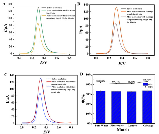 The possible matrix effects were investigated using the relative response value method and the results are shown in Figure 12. As seen in Figure 12A–C, the proposed sensors showed almost no change in DPV responses after incubation with the original actual samples. Subsequently, after incubation of the sensors with pure water containing 1 mg/L PQ and the actual samples containing 1 mg/L PQ for 60 min, respectively, the current drop percentage (ΦI (%)) was measured and the matrix effect was estimated according to ME = A/B, where A is the ΦI% caused by PQ in pure water matrix and B is the ΦI% caused by the same level of PQ in real sample matrix. It can be seen that the ME was between 98.98–101.73% (Figure 12D). The above results shows that the matrix effect is negligible.