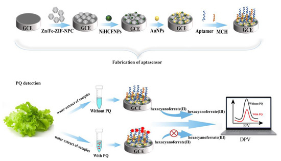 Herein, we propose a new label-free electrochemical aptasensor that can be used for the determination of PQ in vegetables with high specificity and sensitivity. The sensing interface was designed using NiHCF-NPs, immobilized directly on the working electrode as redox probes to produce sensing signals, thus overcoming the disadvantage of needing to label electroactive substances on the aptamer or target molecule. Zn/Fe-ZIF-NPC modified on GCE acted as an electrocatalyst to improve the electrochemical signal produced by NiHCF-NPs. Subsequently, AuNPs were electrodeposited on the NiHCF-NPs/Zn/Fe-ZIF-NPC/GCE. The deposited AuNPs not only bound the aptamer to the GCE surface, but also greatly increased the sensing signals. After the PQ molecules in test solution were bound to the Apt/AuNPs/NiHCF-NPs/Zn/Fe-ZIF-NPC/GCE via the affinity of aptamer, the change of current signal was measured and used as the quantitative indicator to achieve a simple, reliable and highly sensitive detection of PQ. To the best of our knowledge, although three aptamer-based PQ detection methods have been reported [22,27,28], they are all based on the colorimetric technique. So far, electrochemical aptasensors for PQ detection have not been reported yet.