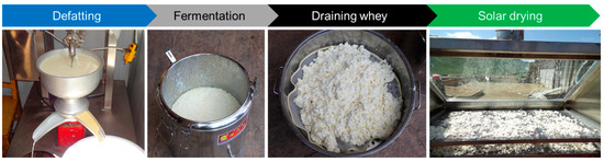 Yak milk was obtained from a yak breeding demonstration base in the Gannan pastoral areas of Gansu Province, China. After removing debris, such as hair and dust, yak milk was defatted using a cream separator and fermented for 48 h at a temperature of 20–25 °C (Figure 1) [19]. Fermented and completely solidified casein was drained to remove whey and dehydrated using the solar dryer employed in the current work, which is described in Section 2.2. The whey content of Qula was 52.6 ± 0.68% (wet base) prior to drying, which was determined in accordance with the method reported in previous research [2]. The raw Qula casein is a milky white granular material with an average moisture content of about 62.50%, fat content of 2.15 ± 0.26%, protein content of 32.43 ± 0.75%, and lactose content of 1.69 ± 0.18%.