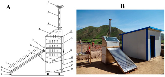 This solar dryer was fabricated in the region of Qinghai-Tibet Plateau, China, located in the pastoral area in Xiahe county (101°54′–103°25′ N latitude, 34°32′–35°34′ E longitude, and an altitude of 3000 m), which receives solar radiation of more than 2200 h per year [8]. A schematic diagram and picture of the facility employed in the present study are illustrated in Figure 2A and Figure 2B, respectively. The mixed-mode solar dryer mainly consists of a solar collector system and drying chamber exhaust system (chimney). The dimensions of the drying chamber are 1.2 m long, 1.0 m in height, and 0.8 m in width and of the solar collector are 2 m long and 1 m in width. Five trays with equally spacing were arranged in the drying chamber. The temperature was measured by a temperature sensor with an accuracy of ±0.3 °C (PT100, TD Sensors Technology, Shanghai, China), which was placed at the inlet and outlet of the drying chamber. The wind velocity was detected by a digital anemometer (AS8836, Smart Sensor, Shenyang, China, with an accuracy of ±0.001 m/s) placed at the hot air inlet and outlet. After the test began, the tray was taken out every 1 h, weighed, and recorded until the dry base moisture content of the material was lower than 12.0%, which was the drying end point, and the test was stopped.