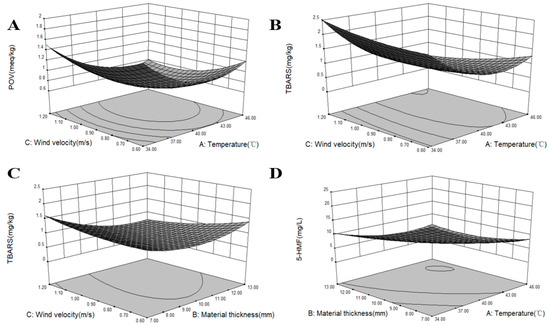The effects of three optimization conditions on the POV, TBARS values, and 5-HMF contents. (A) The interactive effect of temperature and wind velocity on the POV. (B) The interactive effect of temperature and wind velocity on the TBARS values. (C) The interactive effect of wind velocity and material thickness on the TBARS values. (D) The interactive effect of temperature and material thickness on the 5-HMF contents.