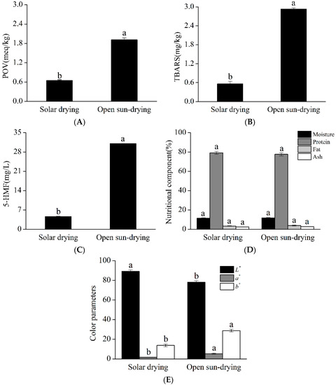 Quality comparison of Qula from solar drying and open sun-drying drying methods. Representative histograms showing the changes in the POV values (A), changes in the TBARS values (B), and changes in the 5-HMF contents (C); changes in the nutritional components (D) and color quality (E). a,b Means in the same color column with different superscripts differ significantly (p < 0.05).