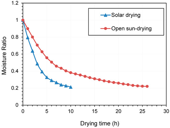 Based on the optimized solar drying conditions (temperature of 43.0 °C, material thickness of 11.0 mm, and wind velocity of 1.0 m/s), the drying curve was carried out (Figure 6). The drying curve of samples by open sun-drying was also performed, from 8 am to 6 pm each day (total of 26 h) and a temperature range of 25–35 °C during the effective drying process. The moisture content data observed in the drying experiment were converted into the moisture ratio (Figure 6). Solar drying remarkably enhanced the drying rate of Qula compared with open sun-drying, and a batch of drying can be completed within a day. During the initial stage, the removal of surface moisture caused the material to shrink fast and form a hard crust. Thus, the material became gradually impervious to moisture diffusion. Therefore, the surface becomes unsaturated, and the drying rate had a decreasing trend [45]. Our findings are consistent with the study that a solar dryer from solar energy systems is more promising than natural convection solar drying methods due to hygienic characteristics and short drying times [56].