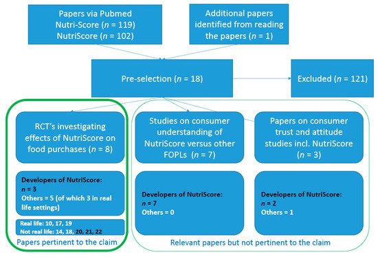 This narrative review is based on a selection of published peer-reviewed papers. To this end, the PubMed database was searched on 31 January 2021 with the keywords [Nutri-Score; 119 results] and [NutriScore; 102 results]. From these identified studies, those were selected that evaluated the efficacy of the Nutri-Score with or without other FOPLs on consumer food purchases, food choices, attitude, opinions and trust, etc., resulting in a final set of 18 papers. Out of those remaining 18 studies, 12 were from the same research group or affiliated with the developers of the Nutri-Score, whereas only 6 were conducted by other scientists. These 18 selected studies were divided into three categories: