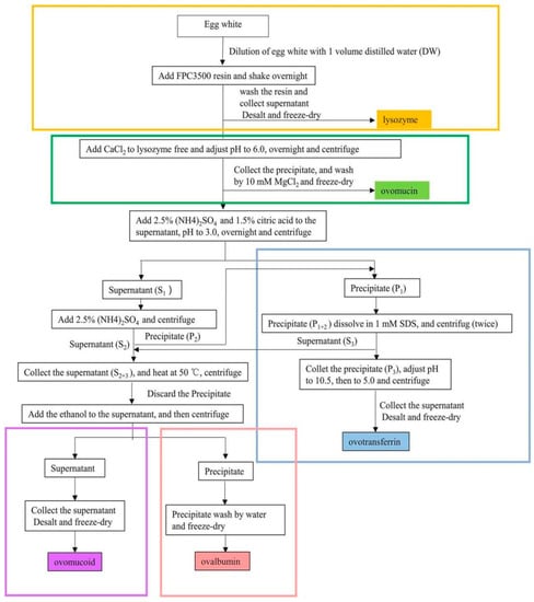 There are some difficulties in the direct separation of target proteins due to the complex composition of EWP, low concentration of target proteins and similar physicochemical properties of proteins [4]. Generally, EWP is subjected to a series of pretreatment processes such as filtration, homogenization, centrifugation and water dilution to obtain the raw material in the separation process. Then, suitable methods are selected to separate the target protein(s) from other substances. When there is only one target protein, the specific methods and parameters of protein isolation should be determined according to conditional tolerance of the target protein and its structures and physicochemical characteristics different from other proteins, such as solubility, molecular weight, polarity and charged situation.