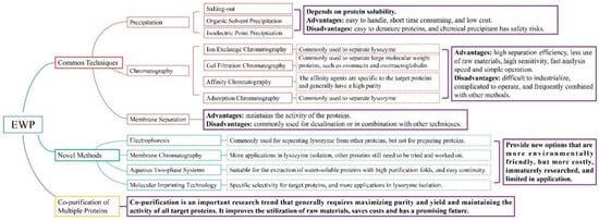 The common methods reported in the literature mainly include precipitation, chromatography and membrane separation technology. These approaches are well established for use and allow for high separation efficiencies. However, there may be disadvantages of long operation time and/or high energy consumption. Moreover, the addition of chemical precipitants may cause reversible/irreversible denaturation of EWP and pose environmental hazards. In recent years, several novel, green and efficient extraction techniques have been developed to overcome the drawbacks of these commonly used processes and without causing environmental problems. In addition, a variety of methods are frequently used to jointly purify one or more proteins to improve egg utilization, reduce costs, and increase recovery and purity. The operational steps of co-purification are usually complex and time-consuming, and the methods used are relatively diverse. Moreover, the possible adverse effects of each step on all target proteins, such as yield loss and activity reduction, need to be considered. These difficulties need to be overcome in the development of co-purification.