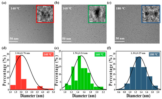 TEM images of CDs fabricated at (a) 140 °C, (b) 160 °C, (c) and 180 °C; insets represent high-resolution TEM images. The corresponding particle size distribution histogram of CDs formed at (d) 140 °C; (e) 160 °C; (f) 180 °C.