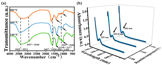(a) FT-IR spectra; (b) UV–vis absorption spectra of mussels-derived CDs prepared at different reaction temperatures.