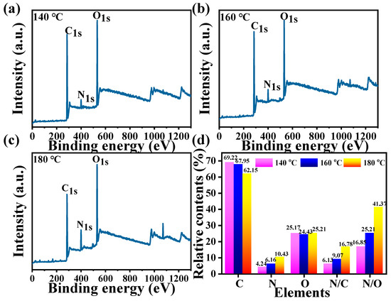 XPS spectra of mussels-derived CDs prepared at (a) 140 °C, (b) 160 °C, and (c) 180 °C, respectively; (d) relative contents of C, N, and O in mussels-derived CDs formed at different reaction temperatures.