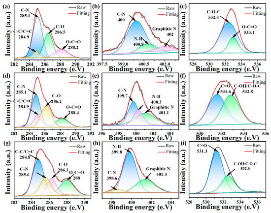 XPS high-resolution scans of the 140-CDs (a) C1s; (b) N1s, and (c) O1s. XPS high-resolution scans of the 160-CDs (d) C1s, (e) N1s, and (f) O1s. XPS high-resolution scans of the 180-CDs (g) C1s, (h) N1s, and (i) O1s.