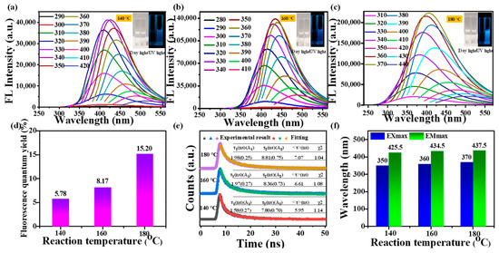 (a–c) Fluorescence emission spectra (the photographs of CDs water solutions under daylight and UV light were shown at the insets), (d) fluorescence quantum yield of mussels-derived CDs fabricated at 140 °C, 160 °C, and 180 °C, respectively, (e) fluorescence decay and fitting curves, (f) Exmax and Emmax of mussels-derived CDs fabricated at 140 °C, 160 °C, and 180 °C, respectively.