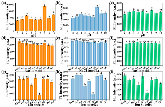 Effects of pH on the fluorescence (FL) intensity of (a) 140-CDs; (b) 160-CDs; (c) 180-CDs. Effects of the NaCl concentration on the fluorescence intensity of (d) 140-CDs; (e) 160-CDs; (f) 180-CDs. Effects of metal ions on the fluorescence intensity of (g) 140-CDs; (h) 160-CDs; (i) 180-CDs. Different lowercase letters (a–g) represent significant difference (p < 0.05).