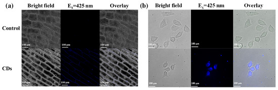 Image of (a) onion epidermal cells treated in 180-CDs for 10 min, (b) HepG2 cells treated with 180-CDs for 24 h. Cells without CDs treatment were used as control.