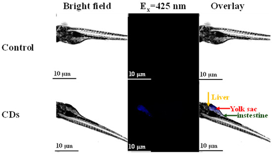To assess the bioimaging ability of mussels-derived CDs in vivo, zebrafish larvae were fed with 180-CDs for 48 h. It was observed clearly that blue fluorescence was concentrated in the livers, yolks, and intestines of zebrafish incubated with CDs compared to the control group (Figure 8) [17]. This implies that CDs might enter into the zebrafish by mouth. These results signify that mussels-derived CDs are biocompatible and appropriate for bio-imaging in vivo.
