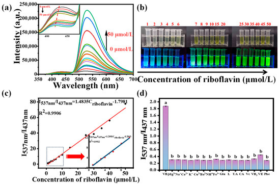 (a) Fluorescence emission spectra and (b) photographs of CDs–riboflavin system under 365 nm UV light during stepwise titration of riboflavin with 0–50 μmol/L, (c) linear relationship between I537 nm/I437 nm and the concentration of riboflavin in the range 1–50 μmol/L, (d) the selectivity of the proposed method for riboflavin under optimal experimental conditions. Different lowercase letters (a,b) represent significant difference (p < 0.05).