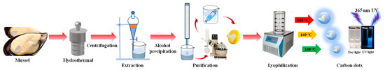 Mussels are naturally inexpensive and rich in nutrients, which consist of proteins (58.7%), carbohydrates (22.5%), and lipids (7%). China has the highest production of mussels in the world, with an annual production of more than 800,000 tons [18]. Abundant components such as carbon, nitrogen, and oxygen motivate us to employ mussels as carbon sources to form cost-effective CDs with high quantum yields. Meanwhile, to the best of our knowledge, mussels have not been previously used to synthesize CDs.