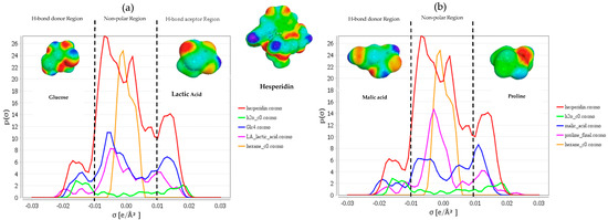 (a) Sigma profile of hesperidin (red), water (green), glucose (blue), lactic acid (pink), and hexane (orange). (b) Sigma profile of hesperidin (red), water (green), malic acid (blue), L-proline (pink), and hexane (orange) and their sigma surfaces. H-bond, hydrogen bond.