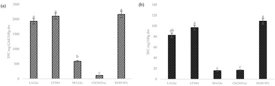 To demonstrate the accuracy of COSMOtherm software and validate the model, extracts were prepared with the NADES with the highest and lowest lnγ values. Extractions were prepared with 75% of NADES because the addition of water has been demonstrated to decrease the viscosity of NADES and, in consequence, enhance the mass transfer from plant matrices to the solution, increasing the extraction efficiency [22]. The selected NADES for the validation were lactic acid:glucose (LA:Glu), L-proline:MA (LP:MA), malic acid:glucose (MA:Glu), and choline chloride:fructose (ChChl:Fruc). Furthermore, to compare the results, an extraction with EtOH (50% v/v) was performed as a control. Total polyphenols (TPC) and total flavonoids (TFC) were measured to validate the model, and the results are shown in Figure 2 and were in good concordance with the prediction of COSMOtherm. There was no significative difference (p < 0.05) between LA:Glu (1932 ± 7.83 mgGAE/100 gdw and 82.7 ± 3.01 mg/100 gdw), LP:MA (2164 ± 5.17 mgGAE/100 gdw and 97.0 ± 1.65 mg/100 gdw), and EtOH extract (2164 ± 8.97 mgGAE/100 gdw and 109 ± 5.22 mg/100 gdw) for TPC and TFC, respectively. These results highlight the possibility of NADES replacing conventional solvents such as ethanol for polyphenol and flavonoid extraction. In contrast, the lowest extraction efficiencies were in ChChl:Fruc for TPC and in ChChl:Fru and MA:Glu for TFC. This was also expected due to the fact that ChChl:Fruc has sugar and belongs to the group of solvents with pH values close to 6, which does not favor the extraction of polar compounds. Based on these results, it is possible to conclude that activity coefficient calculation in COSMOtherm software is a good tool to predict the solubility of hesperidin in NADES.