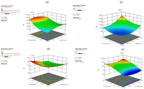 This can be explained because when higher % of NADES exist, the hydrogen bond interaction between the target compound and solvent are stronger, and the addition of water in more than 50% may be considered an aqueous solution, and the components can be dissociated [17]. In the second interaction for TPC, it is clear that longer extraction time and high %NADES can increase the extraction yields. A short extraction time can be insufficient for some bioactive compounds, but a longer extraction time can produce degradation of the extracted compounds [35]. In other studies, it has been reported that extraction yield can increase with longer extraction time but also can decrease after long periods [36]. Moreover, long periods of time extraction can contribute to the degradation of bio compounds, and a high solvent-to-solid ratio can increase the dispersion of the solvent in the sample, reducing the extraction performance [37,38].