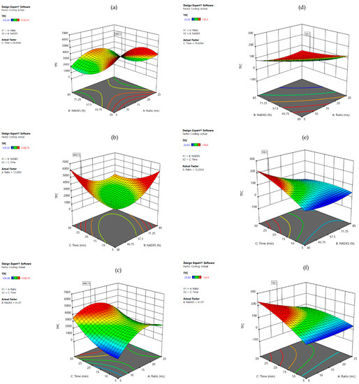 Response surface plots were created to show just the significative interactions between two variables on the response values. In Figure 3 are shown the 3D plots using LA:Glu as solvent for TPC and TFC. In Figure 2a are presented the response surfaces for TPC generated first by the %NADES and solid/liquid, and it was observed that by increasing the % of NADES and decreasing the ratio, a higher yield of TPC is achieved.