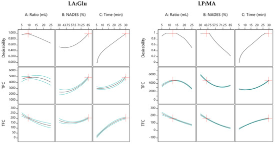The final goal of RSM was the process optimization where the developed models can be used to predict the TPC and TFC. By applying the desirability function and considering the maximum responses, the optimal conditions for the extraction of TPC and TFC simultaneously from orange peels were calculated using LA:Glu and LP:MA. In the first case, the optimal conditions are represented in Figure 5 and were 9.36 mL of solid:liquid ratio, 85% of NADES, and 30 min of extraction time. Under these optimal conditions, the extraction yield of TPC was 4862 mg GAE/100 gdw, and in this case, this NADES extracted a higher concentration of TPC than in other similar studies [39] and for TFC 203 mg/100 gdw. For the second optimization using LP:MA, results are presented in Figure 5, where the optimal conditions were a solid:liquid ratio of 12.2 mL, %NADES of 41.1, and extraction time of 29.6 min; the extraction yields in these conditions were 4680 mg GAE/100 gdw for TPC and 166.1 mg/100 gdw for TFC. Considering these results, it can be clearly observed that optimal parameters can change in different solvents, and it is associated with their physicochemical properties. LP:MA has higher viscosity (0.0150 Pas) [19]; for this reason, it is expected that higher % of NADES in water can reduce the extraction yields.