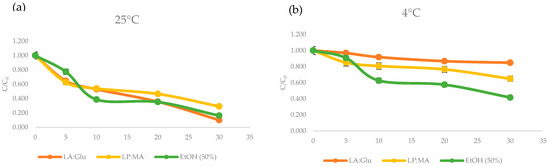One important aspect in the selection of the most appropriate solvent is the stability of the extracted compound in the solvent, and this parameter is an important aspect if the final application includes these extracts in food formulation. The stability was monitored in LP:MA and La:Glu and also with the extraction performed using ethanol (50% v/v). In Figure 6 are presented the results for TPC during storage for 30 days in different conditions: at 25 °C and 4 °C. The results demonstrated decreased values of TPC in all NADES extracts at room temperature, where TPC was more stable in LP:MA extracts, with 70% of degradation. Then, at low temperatures, TPC in LA:Glu showed degradation of 15% at 4 °C and LP:MA 35% after 30 days. In all the storage conditions, DES extracts showed better stability of polyphenols when compared with ethanol extract. Other studies have reported that DES contributes to the stabilization of phenolic compounds. Panic et al. [19] reported that extracts with choline chloride:citric acid enhances the stability of 70% of anthocyanins at 4 °C. Additionally, Dai et al. [41] reported that LA:Glu systems provide better stability of cyanidin when compared to ethanol extractions. These results can be explained due to the interaction between the phenolic compounds and the components of NADES mixtures, which decrease the movement of solutes molecules and reduce their contact time with oxygen, and in consequence, the oxidative degradation is reduced [41,42]. The enhanced stability of TPC in NADES extracts indicates their potential application in the fortification of food products, and this characteristic can contribute to extending the shelf life of the enriched products.