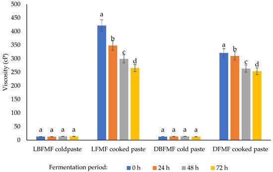 The viscosity of spontaneously fermented FM flours is shown in Figure 1. According to the cold paste results, there were no significant differences (p < 0.05) observed among the flour samples. The cooked paste viscosity for native FM flour was significantly higher than that of spontaneously fermented FM flours. Uvere et al. [] noted that the decreasing trend observed in fermented flours might be attributed to starch granule hydrolysis due to amylase activity during SF. Many studies have also found that the tendency of starch hydrolysis to form sugars results in the reduced viscosity of flour samples in various food processing technologies [,,,]. Uyere et al. [] stated that a decrease in viscosity in fermented FM flours could also be due to granule structural degradation caused by milling, resulting in an increase in the amount of soluble materials such as dextrin with a short chain and some sugars.