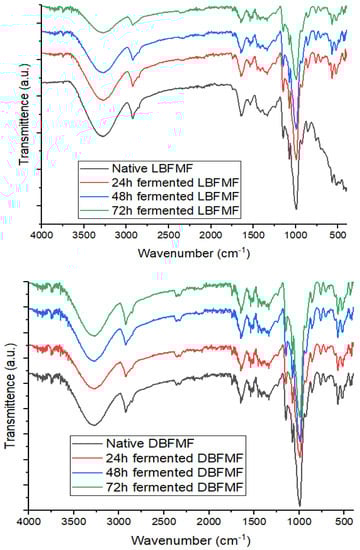 The C–H band’s width increased in the two flours as the fermentation period increased, with absorption peaks ranging from 2924.29 to 2925.35 cm−1 and 2924.47 to 2925.49 cm−1, respectively. This was probably caused by the stretching vibrations of aromantic and aliphatic C–H bonds []. The variation in the peaks could be correlated to differences observed in the fat content of fermented FM flours as reported by Mudau et al. []. They were also peaks within the range of 1644.55 to 1651.86 cm−1, denoting the presence of amide I (stretching and bending vibrations of C=O).