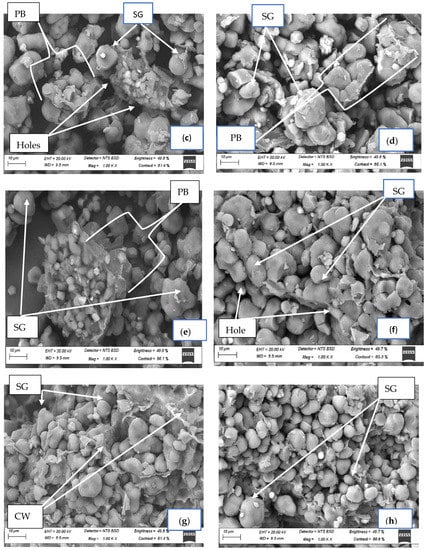 Scanning electron micrographs of fermented light- and dark-brown FMF: (a) native light-brown FMF; (b) native dark-brown FMF; (c) 24 h fermented light-brown finger millet; (d) 24 h fermented dark-brown FMF; (e) 48 h fermented light-brown FMF; (f) 48 h fermented dark-brown FMF; (g) 72 h fermented light-brown FMF; (h) 72 h fermented dark-brown FMF; PB = protein bodies; SG = starch granules; CW = cell walls; FMF = finger millet flours.