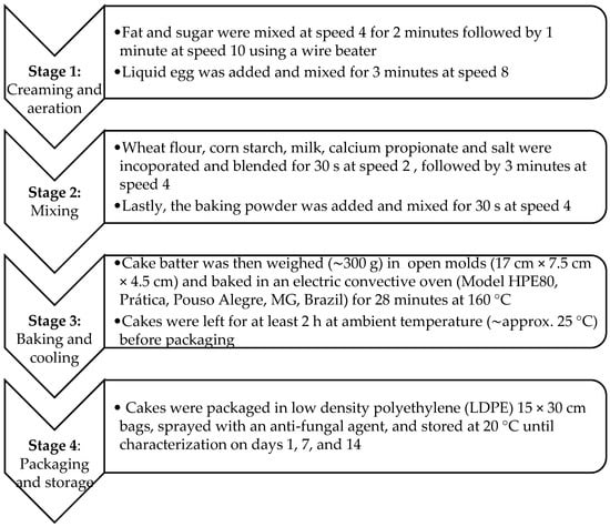The reference batter recipe was a pound cake recipe adapted from (Table 1) [27]. The four cake formulations containing the different types of fat, namely E1, E2, E3, and the palm oil were prepared using a Kitchen Aid mixer (Professional 600 6 QT; St. Joseph, MI, USA). The cake nomenclature was based on the type of fat added to each formulation and was as follows: C1–cake containing fat E1; C2–cake containing fat E2; C3–cake containing fat E3; and C4–cake containing palm oil (control sample). The cake batter was prepared using a four-stage multi-stage mixing approach to improve the aeration (Figure 1). Stage 1 consisted of the creaming and aeration, stage 2 of the ingredient mixing, stage 3 of the baking and cooling, and stage 4, the packaging and storage. It is worth mentioning that prior to the packaging, the cakes were sprayed with an anti-fungal agent. The anti-fungal agent consisted of 400 mL extra hydrated neutral alcohol, 100 mL deionized water, 1.35 g citric acid, 4.25 g sorbic acid, and 3.75 g propylene glycol.