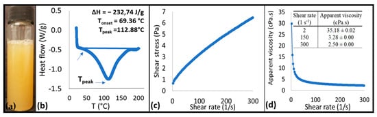 Appearance of CA (a); differential scanning calorimetry (DSC) thermogram (b); flow curve plotted as shear stress versus shear rate (c); and apparent viscosity versus shear rate (d) of CA.
