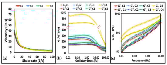The loss-tangent values (tan δLVR), determined by the ratio of G′LVR and G″LVR, were in the range of 0.52 to 0.61, which indicates a mostly elastic behavior. The determination of the flow point (G′ = G″) is of high importance, as it specifies the stress at which the first non-linear structural change appears. In the present research, the C4 had a higher oscillatory stress value at the flow point (~53 Pa) compared to C3 (~17 Pa), C2 (~14 Pa), and C1 (13 Pa), implying that it endures structural changes at greater stress values. Figure 3c shows the frequency sweep analysis that was carried out within the LRV (i.e., 0.1 Pa). The (G′) was always higher than G″ for all of the formulations and no crossover point (G′ = G″) was detected. These results indicate that all of the formulations displayed gel-like behavior within the tested experimental range (0.01–10 Hz).