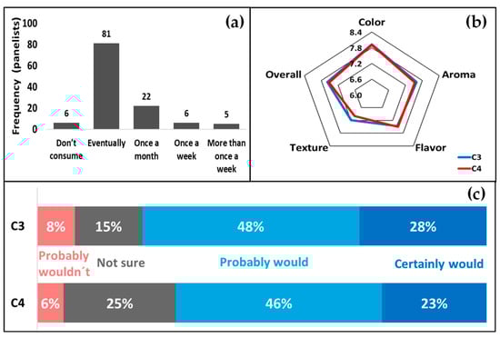 With respect to the consumers’ purchase intentions, 48% and 28% of the panelists reported they “probably would buy” and “certainly would buy” formulation C3, respectively, whereas for formulation C4, the responses were 46% and 23%. On the other hand, more panelists replied they would probably not buy C3 (i.e., 8%) as compared to C4 (i.e., 6%). Moreover, 25% of the panelists replied they were not sure whether they would or not buy C4, whereas for C3 it was 15%. As for the panelists that would certainly not buy the product, the incidence was 0% for both of the formulations (Figure 5c).