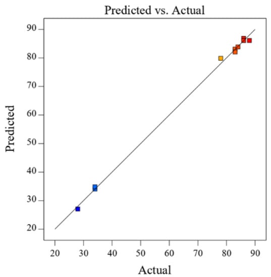 In comparison, the interaction term AB was found to be of less significance. Values greater than 0.1 indicate that the model terms are not significant. The model also showed a statistically insignificant lack-of-fit relative to the pure error, having an F-value of 1.87. Factor B (enzyme loading) has the greatest influence on the system studied, as also highlighted by the perturbation plot (Figure S1 in the Supplementary Materials). The final response equation obtained for the quadratic model was: