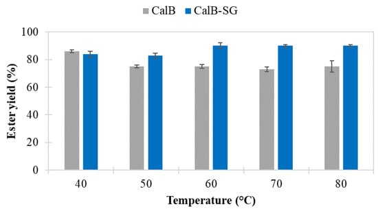 The temperature stability of immobilized enzymes is one of the advantages of sol-gel entrapment because the conformational flexibility of the enzyme is reduced by encapsulation inside the xerogel matrix [15]. Thus, the temperature stability of the lipase from Candida antarctica B (CalB) was studied via preincubation in n-amyl alcohol (also used as the reaction substrate) at temperatures ranging from 40 to 80 °C. The influence of temperature on the ester yield is presented in Figure 4, compared to the native biocatalyst.