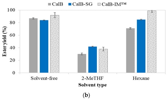 Influence of the reaction medium on the catalytic efficiency (a) and ester synthesis yield (b) of n-amyl caproate at 36 °C, catalyzed by Candida antarctica lipase B (CalB—native lipase; CalB-SG—sol-gel-entrapped CalB lipase).