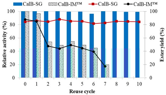 The lipase immobilized by the sol-gel technique proved its superiority, preserving more than 99% of its initial activity, even after 10 reaction cycles. Conversely, the relative activity of the commercially available CalB-IMTM lipase decreased significantly under the selected process conditions, losing up to 80% of its initial value after 7 reuse cycles.