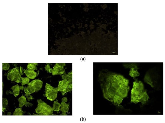 Fluorescence microscopy was performed with an inverted microscope, the Leica DMI4000B (Leica, Munich, Germany), to investigate the distribution of the enzyme within the sol-gel nanostructures. For this purpose, the lipase from Candida antarctica B was dyed with fluorescein isothiocyanate (FITC), as described in the PierceTM FITC labeling kit. The removal of unbound FITC from the obtained solution was carried out by centrifugation in a centrifuge tube with an Amicon Ultra-4 filter (10 KDa cut-off) and repeated washings with distilled water until the absorbance of the collected fractions at the corresponding wavelength of 493 nm was approximately 0.1. The obtained solution (containing the FITC-labeled enzyme) was concentrated to 10 mg protein/mL by centrifugation in the Amicon Ultra-4 filter tube and was used for immobilization, as described in Section 2.2.3. For comparison purposes, a blank sol-gel matrix without the enzyme-FITC complex was also prepared.