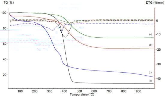 Thermogravimetric measurements (TGA/DTA) were recorded using a TG 209 F1 Libra thermogravimetric analyzer (Netzsch, Selb, Germany) operating at a resolution of 0.1 µg, in a nitrogen atmosphere. Thermogravimetric curves were recorded from 30 to 1000 °C, with a heating rate of 10 °C/min. The average sample mass was 4.0 ± 0.2 mg; the samples were tested in open alumina crucibles (average mass 190 ± 1.0 mg).