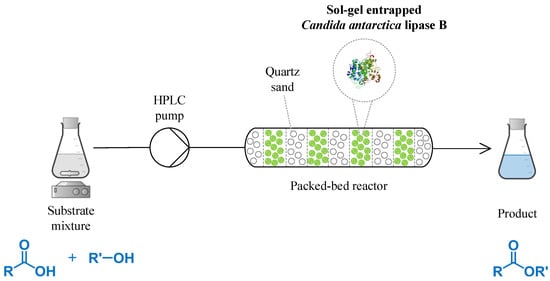 - Woodcock, L.L.; Wiles, C.; Greenway, G.M.; Watts, P.; Wells, A.; Eyley, S. Enzymatic Synthesis of a Series of Alkyl Esters Using Novozyme 435 in a Packed-Bed, Miniaturized, Continuous Flow Reactor. Biocatal. Biotransformation 2008, 26, 466–472. [Google Scholar] [CrossRef]