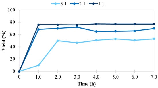 Ester yield (%) in the continuous enzymatic synthesis of n-amyl caproate in a solventless system, catalyzed by sol-gel-entrapped Candida antarctica B lipase at a flow rate of 0.2 mL/min, a temperature of 80 °C, and different substrate molar ratios.