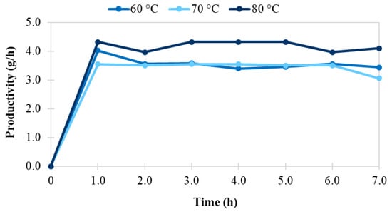 Productivity (g/h) in the continuous enzymatic synthesis of n-amyl caproate in solventless system catalyzed by sol-gel-entrapped Candida antarctica B lipase at a flow rate of 0.4 mL/min, a substrate molar ratio of 2:1 and different temperatures.