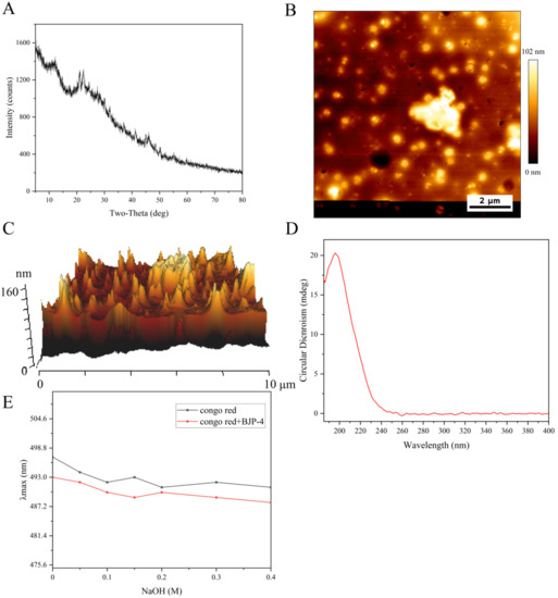 The chemical structure analysis of BJP-4: (A) X-ray diffraction pattern. (B) The atomic force microscope planar image. (C) Three-dimensional image of atomic force microscope. (D) Circular dichroism spectrum. (E) Effect of BJP-4 on the λmax of Congo red.