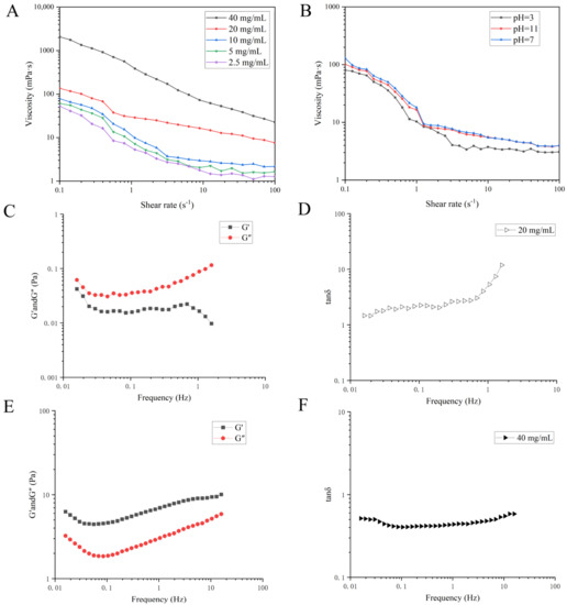 The rheological measurements of BJP-4: (A) Variation in apparent viscosity of different concentration BJP-4 with shear rate. (B) Variation in apparent viscosity of 20 mg/mL BJP-4 with pH change. (C) Frequency sweeps performance at 50% strain for determining the storage modulus G′ and loss modulus G′ for 20 mg/mL BJP-4 solution. (D) The tanδ of 20 mg/mL BJP-4. (E) Frequency sweeps performance at 5% strain for determining the storage modulus G′ and loss modulus G″ for 40 mg/mL BJP-4 solution. (F) The tanδ of 40 mg/mL BJP-4.
