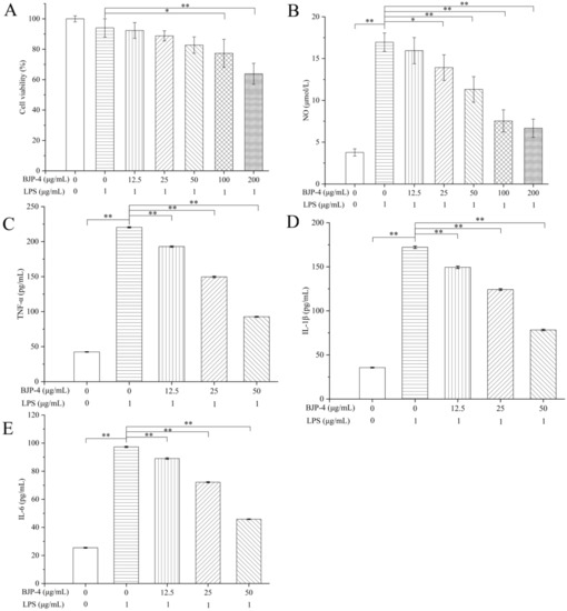 Comprehensive evaluation of the anti-inflammatory activity of BJP-4: (A) Effect of BJP-4 on the viability of RAW264.7 cells. (B) Inhibition of BJP-4 on NO, (C) TNF-α, (D) IL-1β, (E) IL-6 production induced by LPS in RAW264.7 macrophages. Values are expressed as mean ± SD. * p < 0.05; ** p < 0.01.