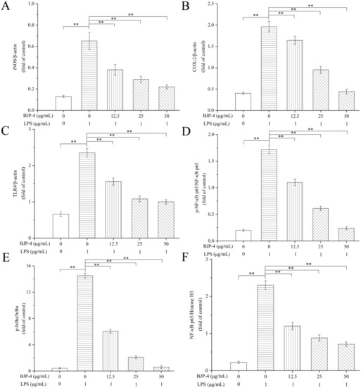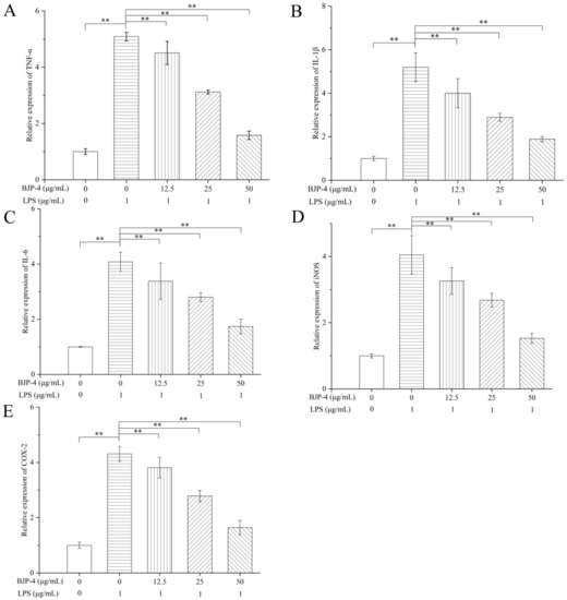 Effects of BJP-4 on LPS-stimulated mRNA expressions: (A) The mRNA levels of TNF-α, (B) IL-1β, (C) IL-6, (D) iNOS, (E) COX-2. Values are expressed as mean ± SD. ** p < 0.01.