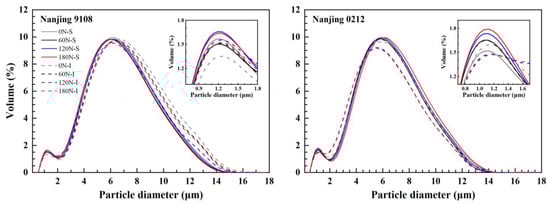 According to Table S2, nitrogen, variety, position, two-factor interactions, and three-factor interactions had significant effect on the starch granule size distribution. The starch granule size distribution of superior and inferior grains of japonica rice appeared as a bimodal distribution between 0–2 μm and 2–16 μm, which was significantly different under different PNF (Figure 1). Starch granule size was classified into small starch granules (≤2 μm), medium starch granules (2–5 μm) and large starch granules (≥5 μm) according to Hu et al. [39]. The starch granule size distribution of superior and inferior grains of both varieties differed.
